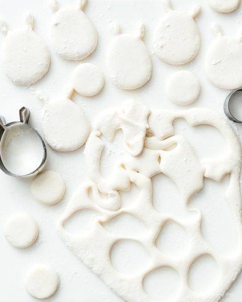 Turn the marshmallows out onto a cutting board. Coat the edges of a Totoro or Round cookie cutter in powdered sugar and cut out. Dust the edges with powdered sugar and set aside while you finish cutting out your Totoros.