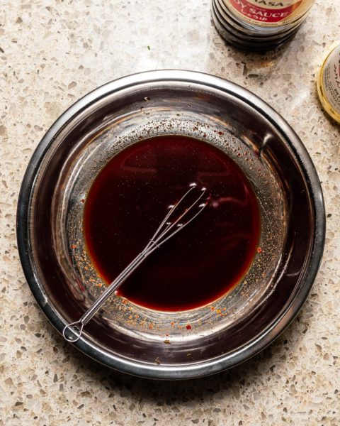 In a bowl, whisk together the soy sauce, rice vinegar, sesame oil, and dark soy sauce and set aside.