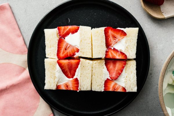 A classic Japanese fruit sandwich with fluffy bread, cream, and strawberries