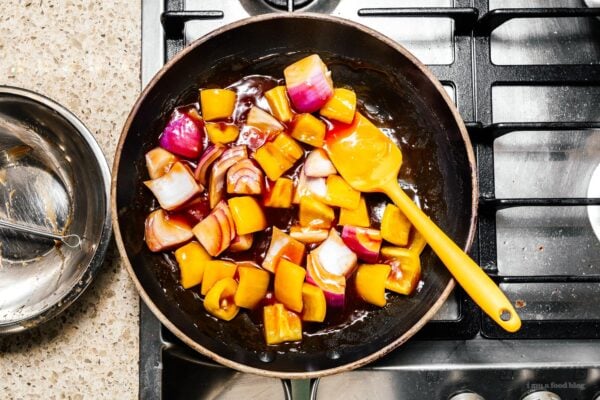 Add the sauce to a nonstick pan and bring to a boil. Once bubbling, turn the heat to low and add the vegetables. Cook until your desired doneness then remove from the heat (we keep the vegetables almost raw).