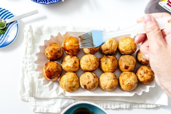 The takoyaki are done when they’re lightly brown and crispy on the outside and they turn easily in their holes. Overall I’d say it takes about 10-15 minutes per batch, from start to finish, depending on how crispy or soft you like your takoyaki.