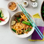 Turn the heat down to medium. Add the snap peas. Cook for 1 minute, stirring until snap peas are bright green. Add the udon and sauce and cook, stirring, until the noodles are coated and glossy. Garnish with the green onions, cilantro and lime if desired and enjoy!